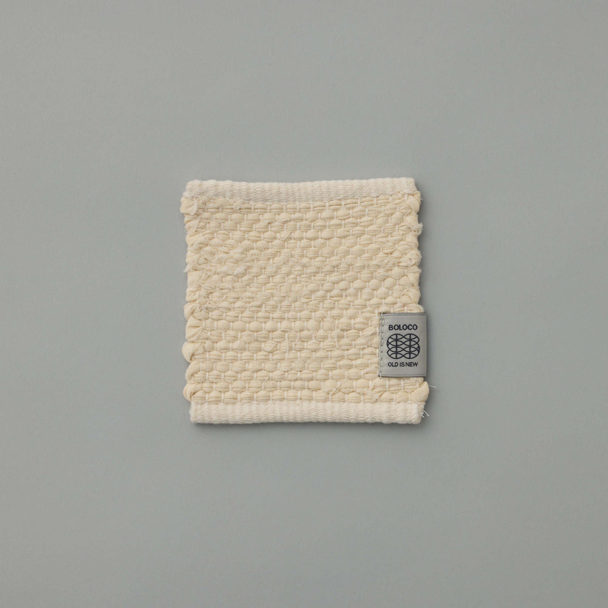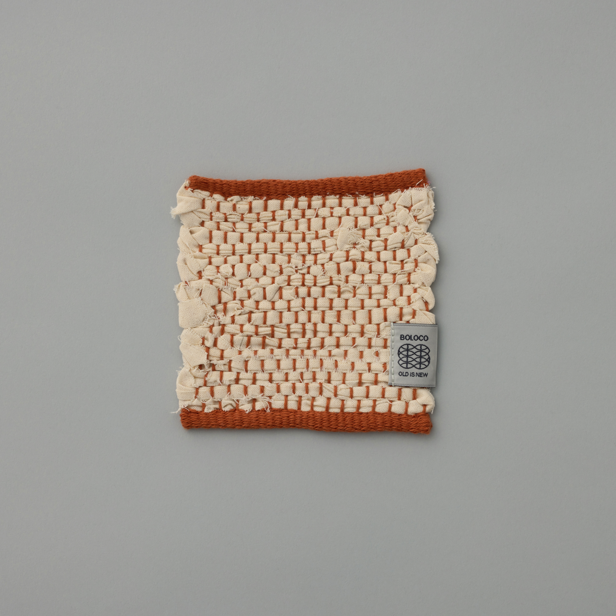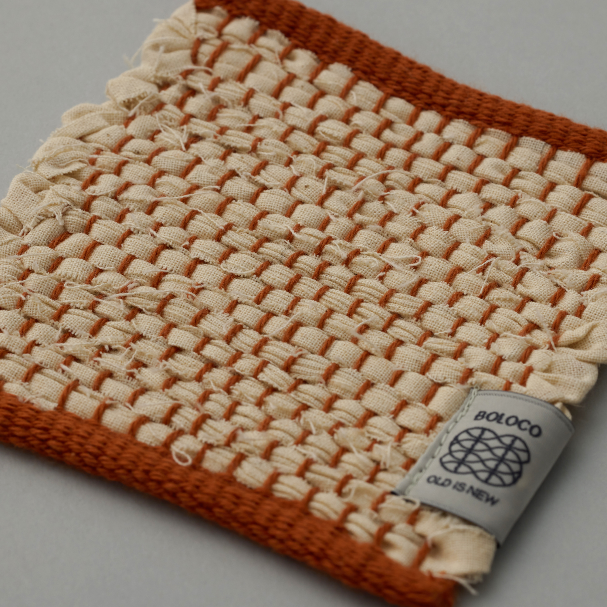 裂織のコースターです。アパレルメーカーや服飾専門学校から「仮縫い」として使われ棄てられるはずだった「シーチング」の端材を回収し、裂いて緯糸として再利用しました。民芸品らしい風合いを持ちつつ、シーチングの生成色に綿糸のカラーを織り混ぜることで、現代のライフスタイルにも合う佇まいになりました。1点ずつ裂織作家が手織りで制作しています。