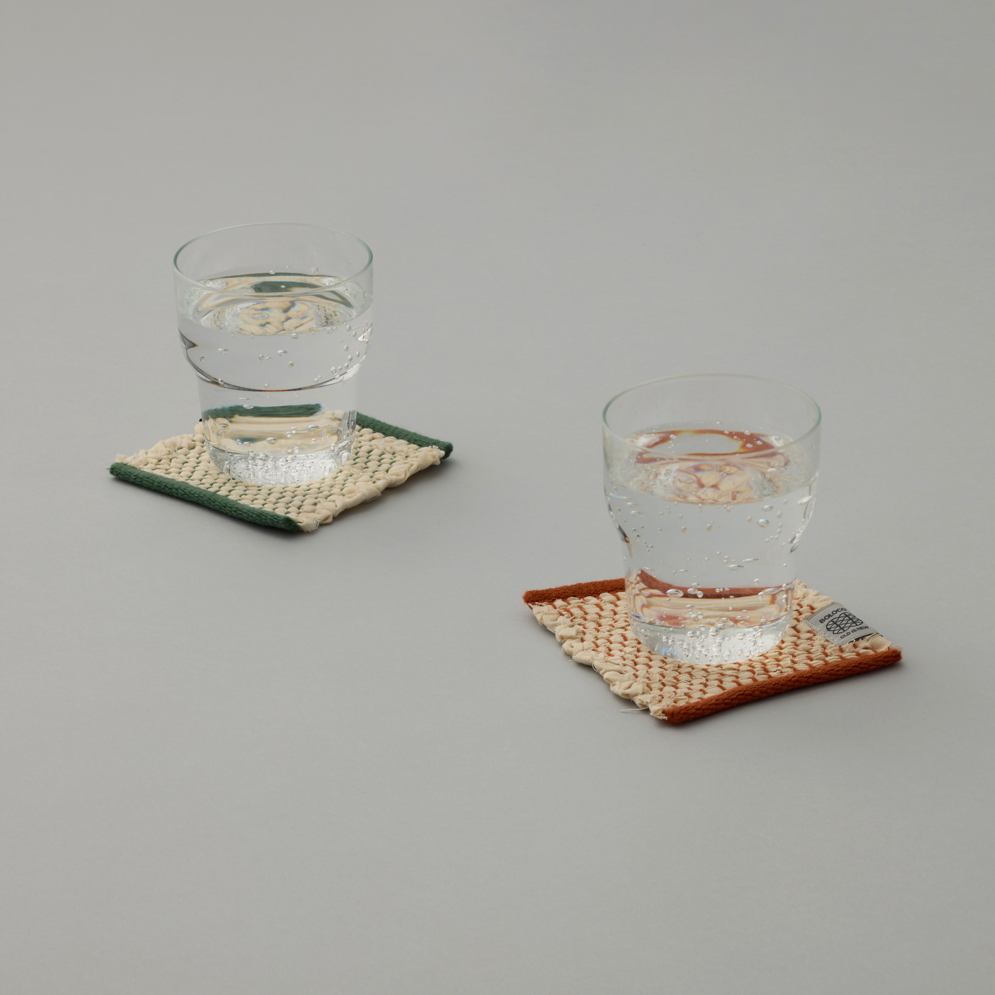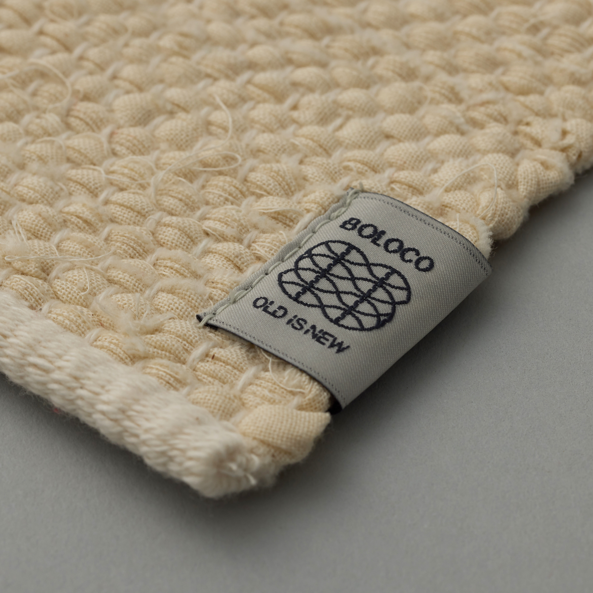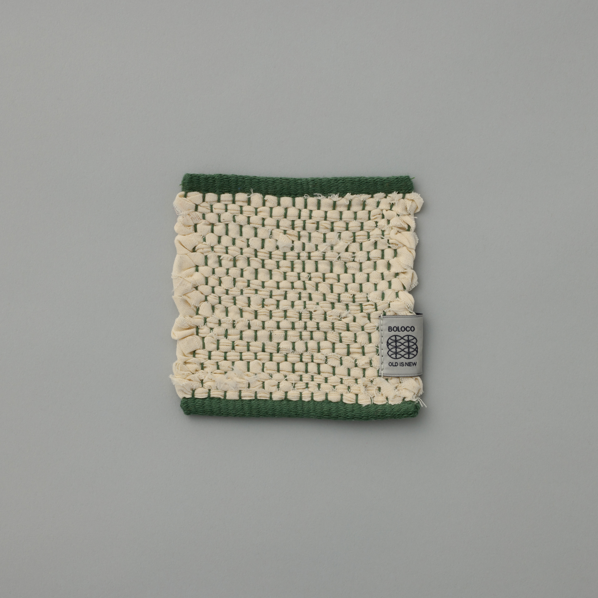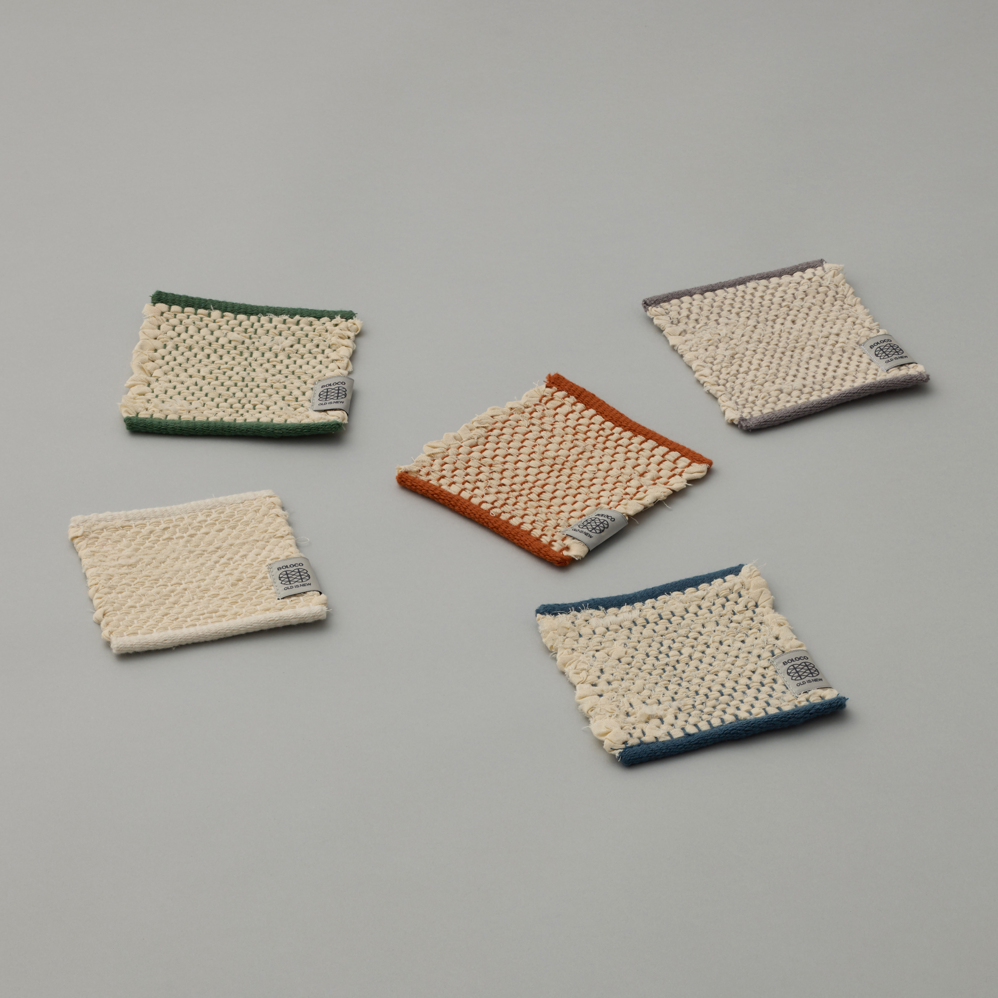 裂織のコースターです。アパレルメーカーや服飾専門学校から「仮縫い」として使われ棄てられるはずだった「シーチング」の端材を回収し、裂いて緯糸として再利用しました。民芸品らしい風合いを持ちつつ、シーチングの生成色に綿糸のカラーを織り混ぜることで、現代のライフスタイルにも合う佇まいになりました。1点ずつ裂織作家が手織りで制作しています。